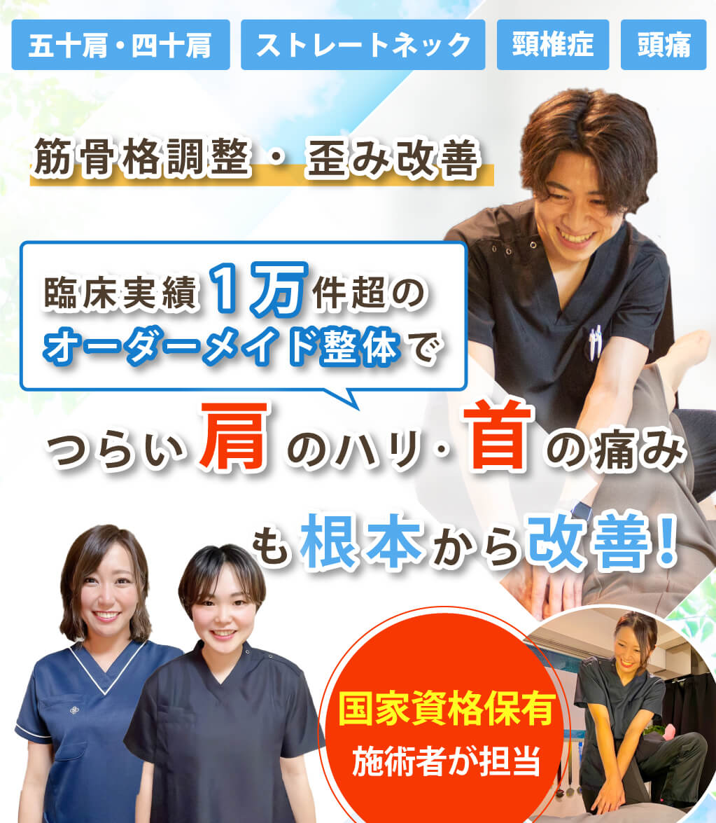五十肩・四十肩、ストレートネック、頸椎症、頸椎ヘルニア、頭痛など首の痛みや肩こりの施術経験が豊富な整体院です。施術して終わりではなく、その後の自宅でできるセルフストレッチや生活習慣の指導もいたします。